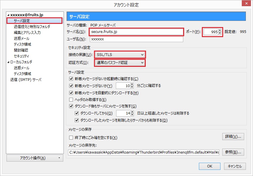 STEP2:左のエリアの「サーバ設定」を選択して、受信サーバの情報を下図のように変更します