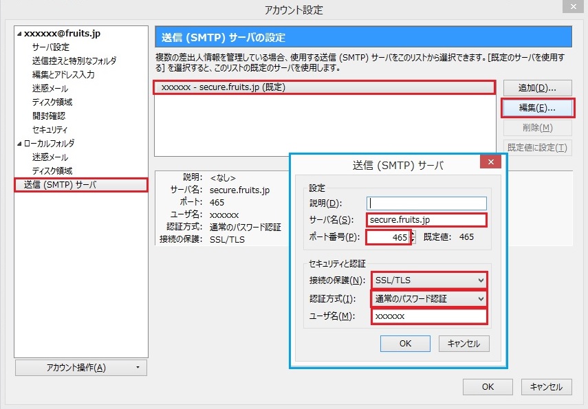 STEP4:(青枠)送信サーバの情報をこのように変更します