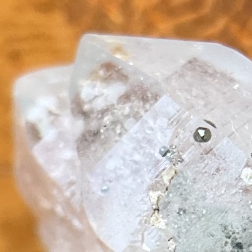 この水晶に入っている黄鉄鉱の内包物の数はとても多く、10個近く入っていそうだが、