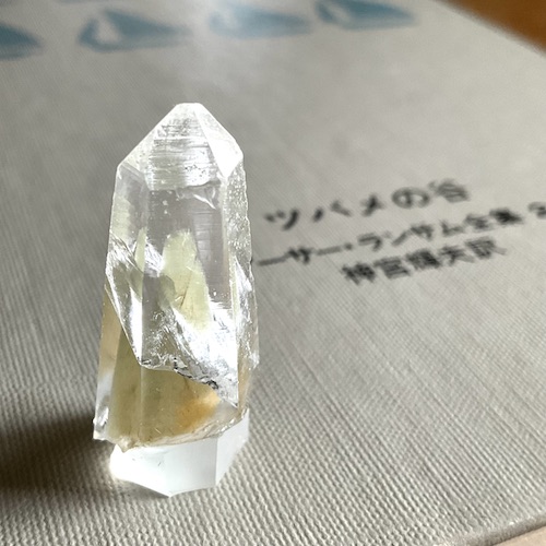 黄緑色の芯が入った透明度の高い、美しい石ではあるが、断面が斜めになっていて