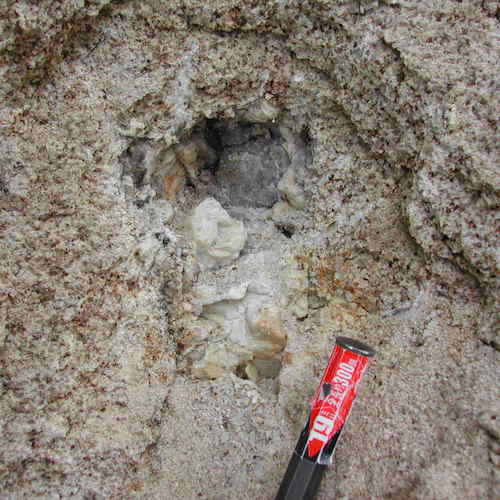 ここは、ちょっとした長石脈を見つけて、かなり時間を掛けて叩いた後の写真である。