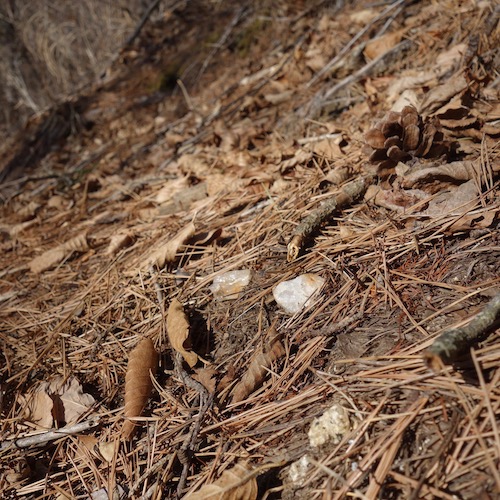 斜度の大きな斜面を歩いていると、ときにこの写真の様に、白い石が落ちているのを目にする。