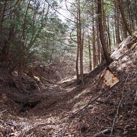 割と山奥の、コルへと向かって行く切り通しのような所で、古い看板に出会った。