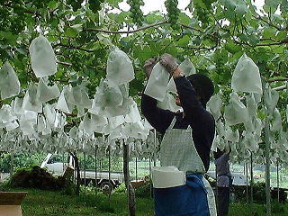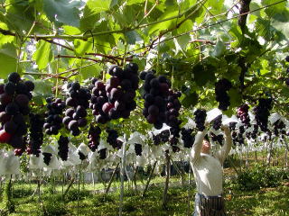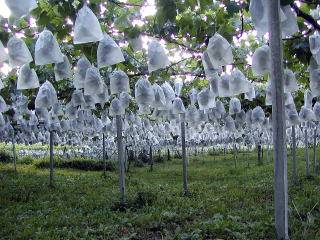 袋掛け 出来上がった巨峰の房に袋を掛けて作業の完了です。