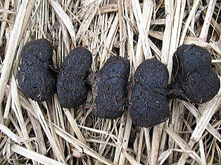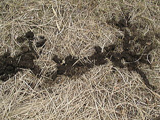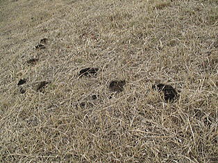 小さな土の山が(一直線ではありませんが)並んでいます。地下でモグラがトンネル工事をしていて,余った土を上に出している跡です。 |