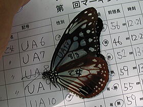 調査用紙とマーキングしたアサギマダラ マーキング後,「死んだふり」をするアサギマダラ