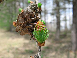 ■カラマツ このパイナップルのようなのがカラマツの雌花。ちょっと意外な感じがするが,とてもきれい。(2007.5.13.撮影)