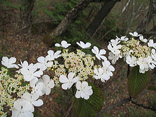 ■オオカメノキ まわりの白い花は飾り花。本当の花は内側の花。林の中でよく目立つ,アジサイのような花。(2007.5.20.撮影)