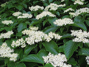 ■ミズキ 遠くから見ると,葉の上にたくさんの白い雲が浮かんでいるように見える。