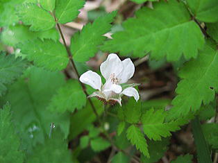 ■サナギイチゴ 林道わきに見られる。なよなよした感じの細いつる草。葉は7枚前後の小葉からなる。(2007.6.3.撮影)