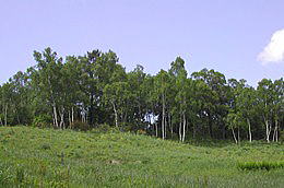 乙女高原の草原のまわりは森(写真1)。その森からたくさんの木のたねが草原に飛んできています。草原内を注意して見れば,ヤナギの仲間やカバノキの仲間の若木がたくさん見つかります(写真2)。やがて,これらの木が大きくなると,草原が林へと変わってしまいます(写真3)。このように,時間がたつにつれて自然が変わっていくことを「遷移」といいます。