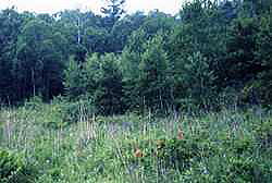 【写真1】まわりは森 【写真2】草原内に生えてきた若木 【写真3】草原が若い森に遷移