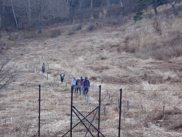 今年の草刈りは、各地でのクマ出没の影響により、中止となりました。山梨市・山梨県・乙女高原ファンクラブ共催の、イベントしての『草刈りボランティア』が中止です。とはいえ、草を刈らないと草原が森へと遷移してしまいます。そこで、乙女高原ファンクラブが呼びかけて、「有志」による草刈りを行うことになりました。これはその1日目、11/15の写真。11/15には15人、11/23には71人の乙女高原ファンが来てくださいました。急きょ、追加してやることになった11/29(土)には11人の有志が来てくださいました。2025年11月15日撮影 |