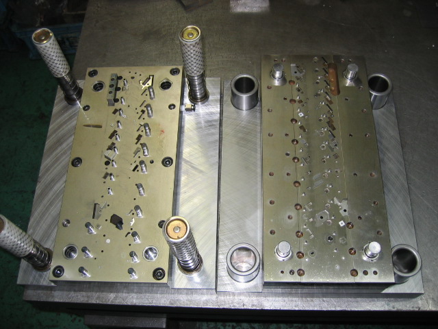 弊社、設計製作した順送型(1100Nクラス)の一例です。量産は板厚t=3.2 材幅300送りピッチ300までの送り装置での対応出来る範囲です。