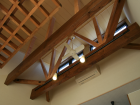 外観は土葬と同じ風合いの塗り壁と焼杉板を採用し、屋内は広い空間と、高さを確保するため鉄骨梁を採用致しました。